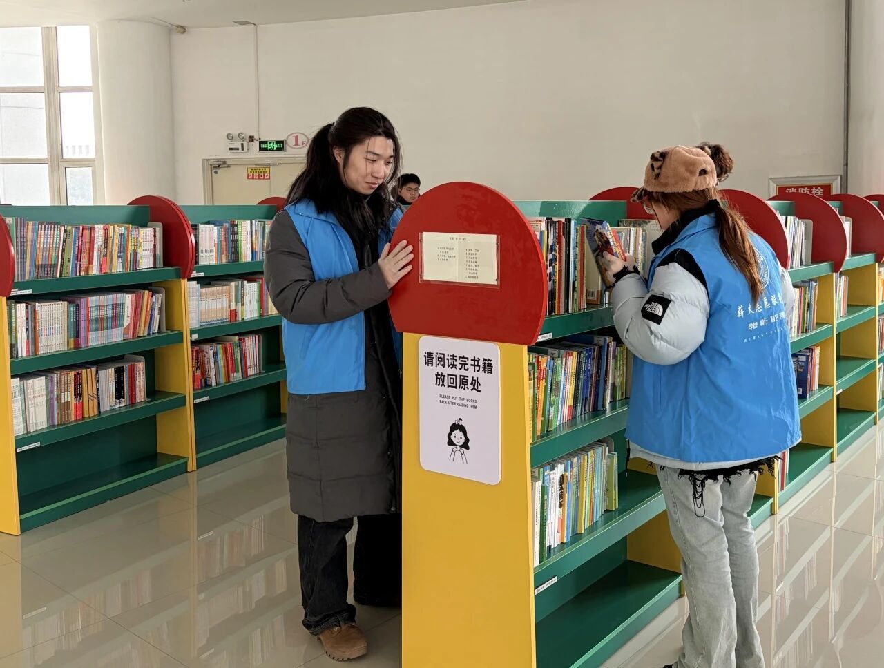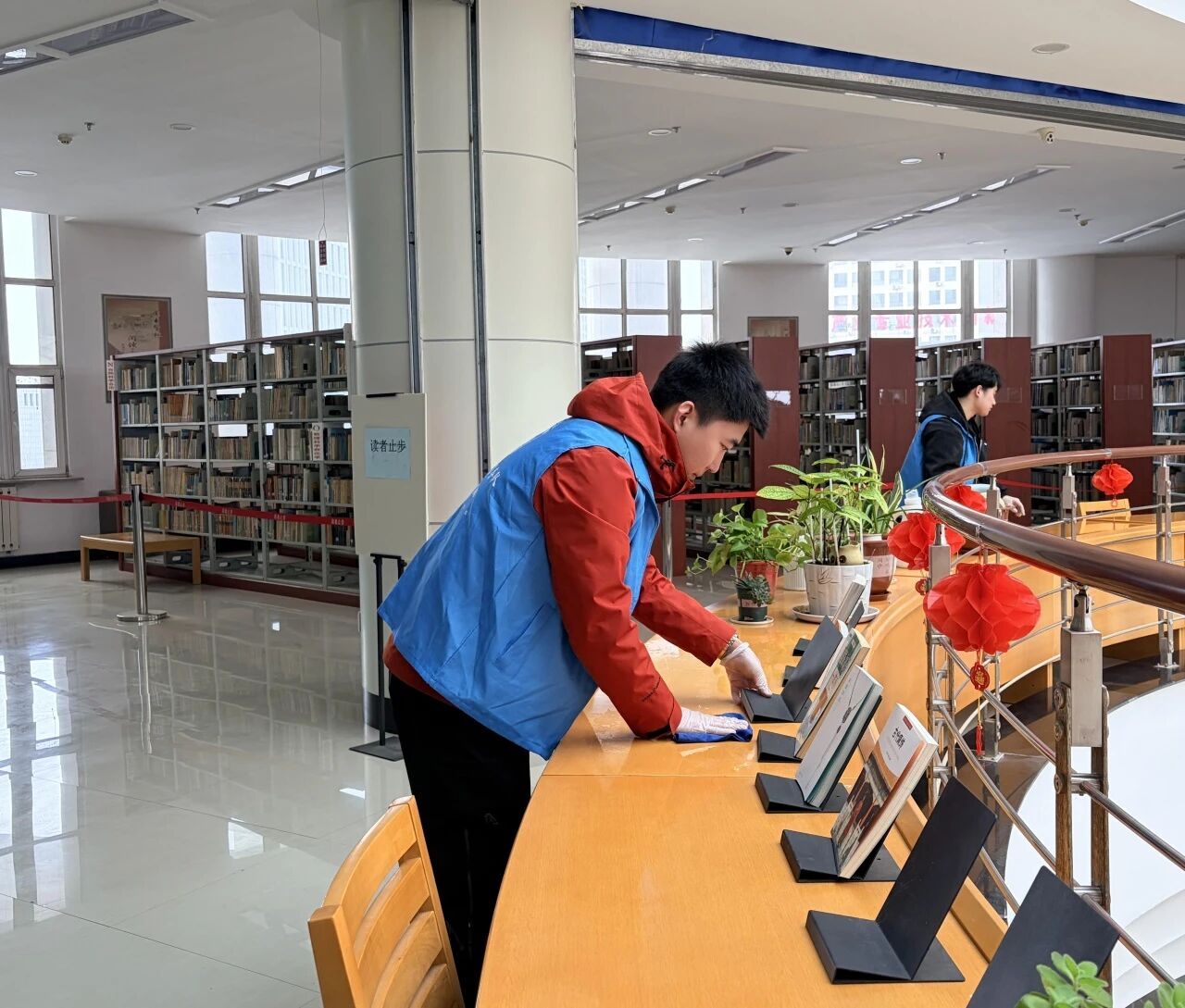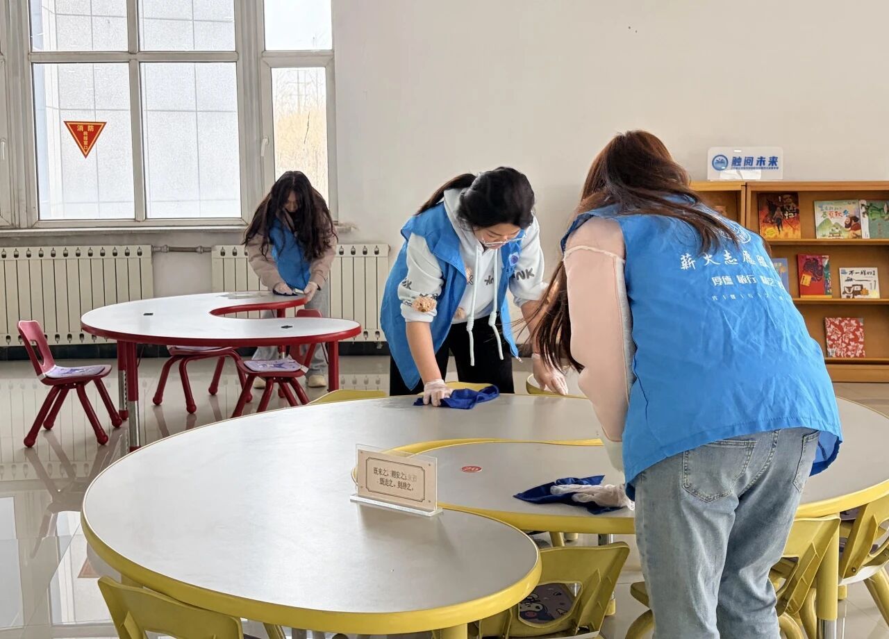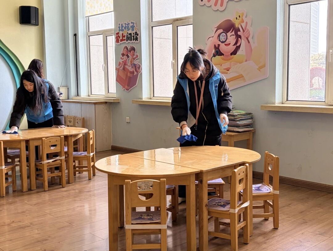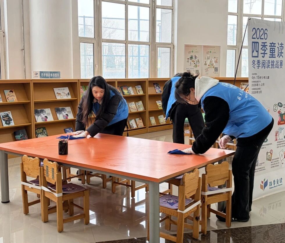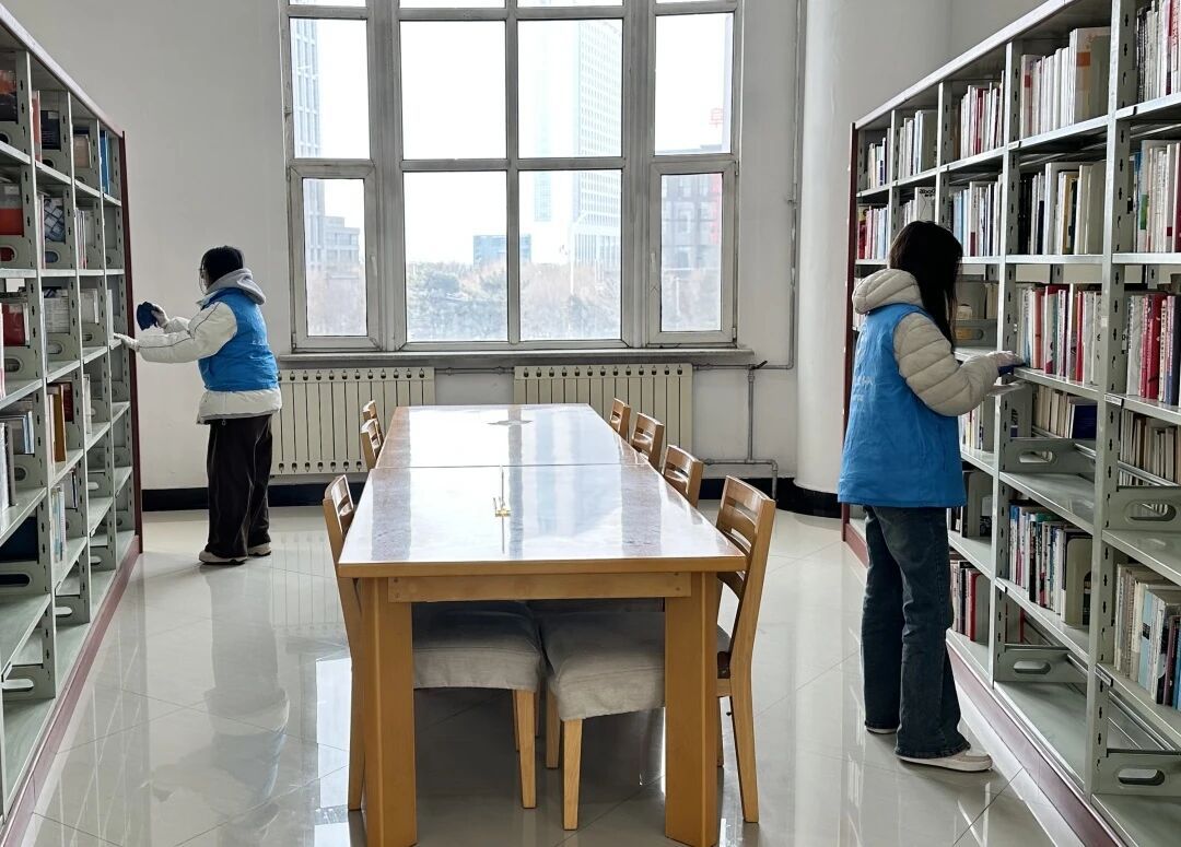 活动现场,志愿者们身着统一志愿服装,分工明确、配合默契。在图书馆工作人员的指导下,大家认真整理书架、归位错位图书、擦拭阅览桌椅、清扫公共区域,细致排查卫生死角。从书架间的耐心分拣,到地面上的认真清扫,每一个角落都留下了志愿者忙碌而温暖的身影。 大家以一丝不苟的态度、热情饱满的状态,将“奉献、友爱、互助、进步”的志愿精神落到实处,既为读者营造了整洁有序、温馨舒适的阅读环境,也在实践中体会劳动价值、传递文明风尚。
